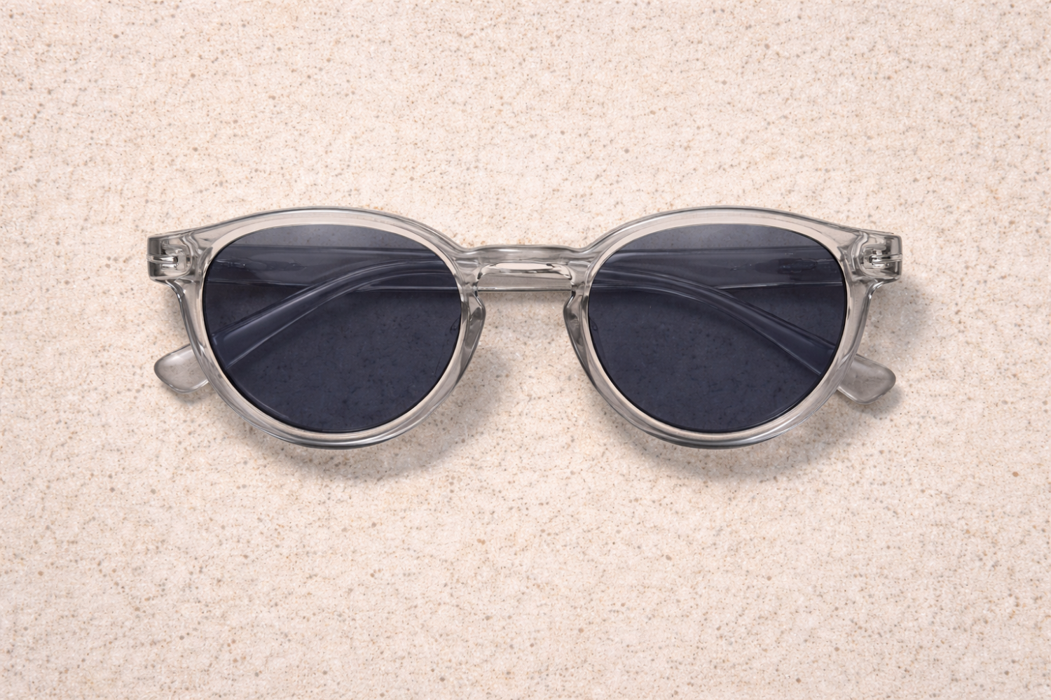 Una mano sostiene unas elegantes gafas de sol de policarbonato transparente para PC sobre un fondo de vaqueros.